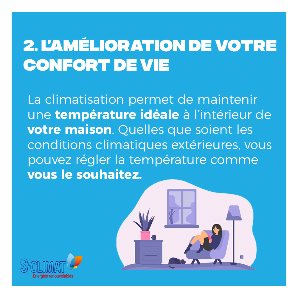La climatisation offre un confort optimal en maintenant une température agréable et constante à l’intérieur de votre maison ou de votre bureau. Quelles que soient les conditions météorologique à l’extérieur. Elle vous permet de créer un environnement frais et confortable, ce qui vous sera particulièrement bénéfique lors des périodes de forte chaleur extrême, qui de nos jours commence de plus en plus tôt. Une température intérieur optimal améliore votre bien-être, réduis votre stresse et vous favorise une productivité accrue.