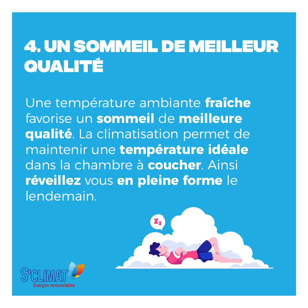 La température de la pièce peut avoir un impact significatif sur la qualité de votre sommeil. Une chambre trop chaude et étouffante peut rendre le sommeil difficile et perturber vos nuits. Une climatisation bien réglée vous permet de maintenir une température adéquate dans la pièce, favorisant ainsi un sommeil réparateur. Une bonne nuit de sommeil offre de nombreux avantages sur votre santé, une meilleur concentration au long de la journée, une meilleure mémoire et un bien-être général.